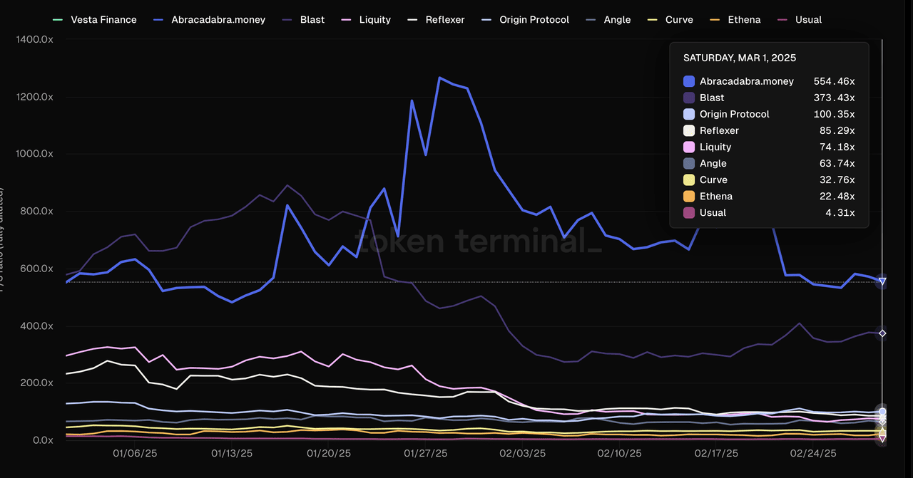 Proporções de PS de projetos de stablecoins excluindo MakerDAO Fonte: Tokenterminal