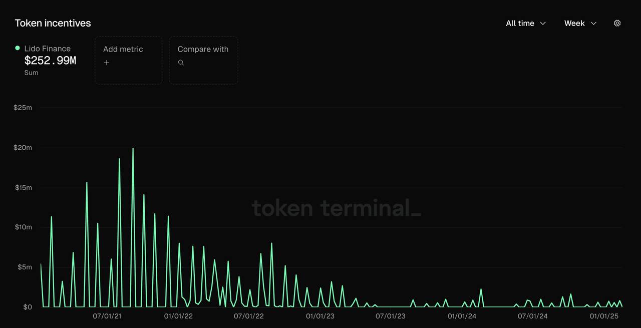 Nos primeiros dois anos após o lançamento (2021-2022), a Lido gastou uma quantia significativa de tokens LDO para incentivar a liquidez de seu stETH e ETH. Ao longo de dois anos, ela gastou mais de US$ 200 milhões em incentivos de tokens, o que ajudou a garantir a liquidez do ETH durante grandes crises de liquidez do mercado, como a proibição da mineração de BTC na China em maio de 2021, a queda da LUNA em maio de 2022 e o colapso da FTX em novembro de 2022. Isso resultou na posição de liderança da Lido em staking líquido na rede Ethereum.