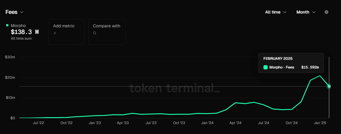 Em fevereiro de 2025, a Aave gerou uma taxa total de 67,12 milhões, enquanto a Morpho gerou 15,59 milhões.