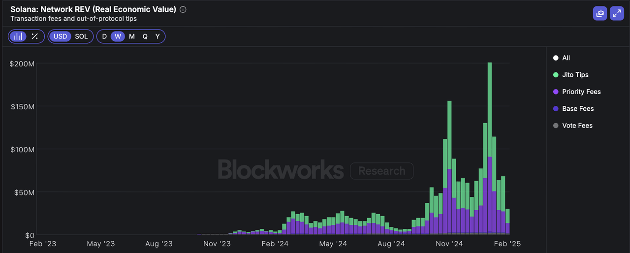 REV da Solana Network (ou seja, taxas totais pagas pelos usuários) Fonte: Blockworks