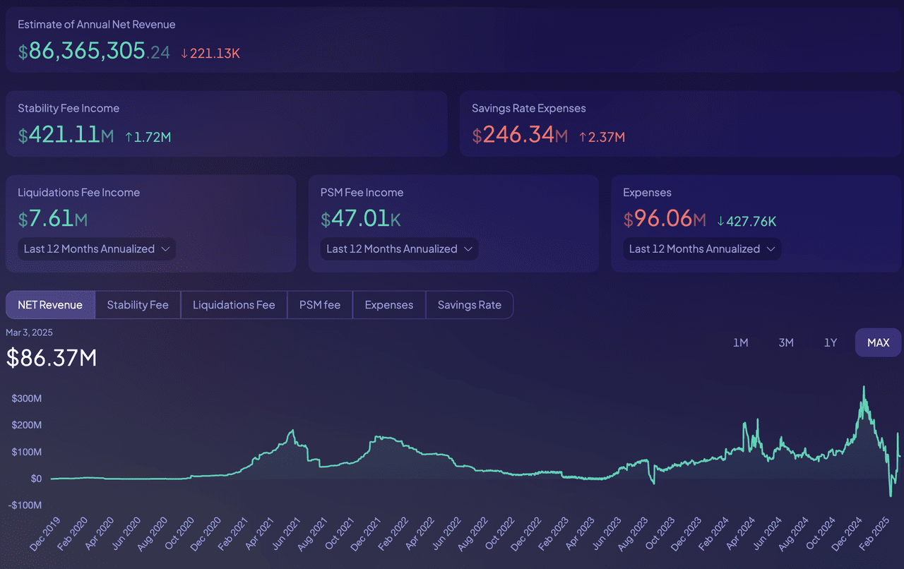 Em termos de seu modelo de negócios, a receita primária da MakerDAO vem das taxas de estabilidade pagas para gerar DAI e do spread de DAI. Este modelo é bem similar ao spread de juros em protocolos de empréstimo: tomar DAI emprestado do protocolo incorre em taxas; fornecer excesso de liquidez ao protocolo (sUSDS e sDAI) rende juros.