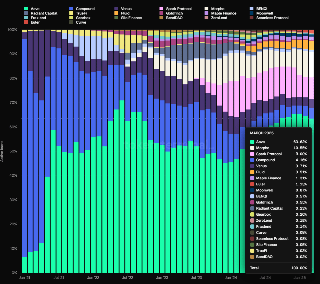 Embora a participação de mercado da Aave tenha aumentado constantemente no ano passado, novos concorrentes como a Morpho estão crescendo rapidamente.
