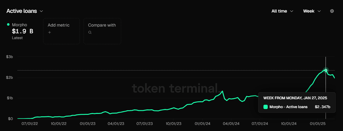 O maior volume total de empréstimos da Morpho, semelhante ao da Aave, foi no final de janeiro, atingindo 2,35 bilhões, e atualmente é de 1,9 bilhão.