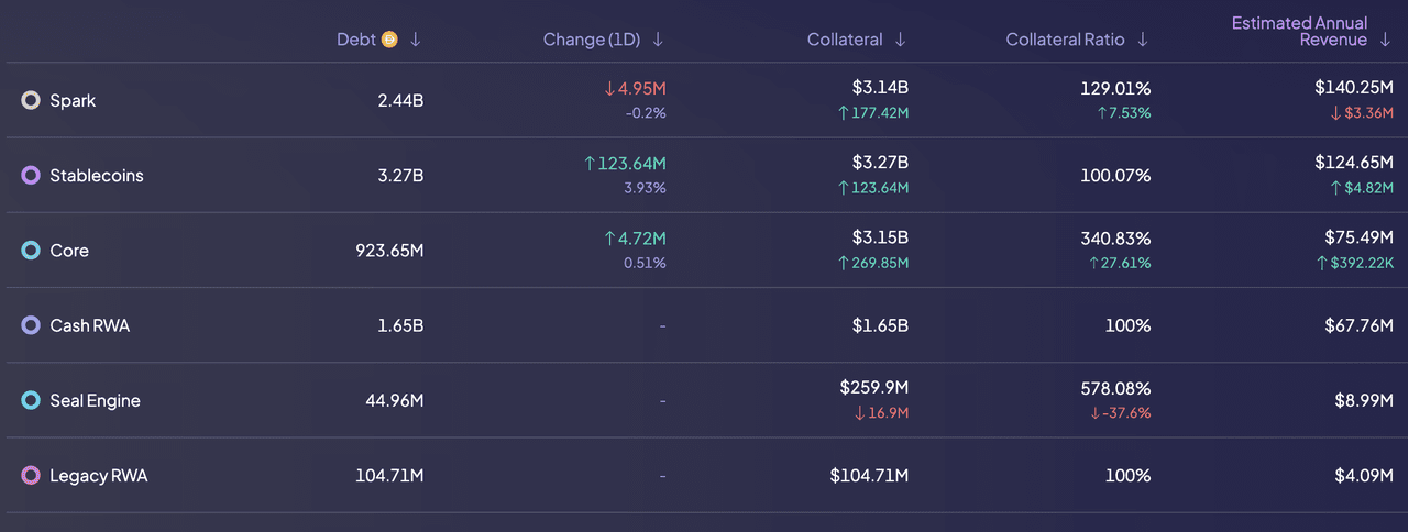 Dentro das taxas de estabilidade, espera-se que o DAI emitido por meio do Spark gere uma taxa de estabilidade anualizada de 140 milhões, enquanto o DAI gerado diretamente do USDC pode render 125 milhões em taxas de estabilidade. Essas duas partes respondem por dois terços das taxas de estabilidade. As taxas de estabilidade restantes vêm do DAI gerado pelo RWA (71,83 milhões) e criptoativos garantidos (78,61 milhões).