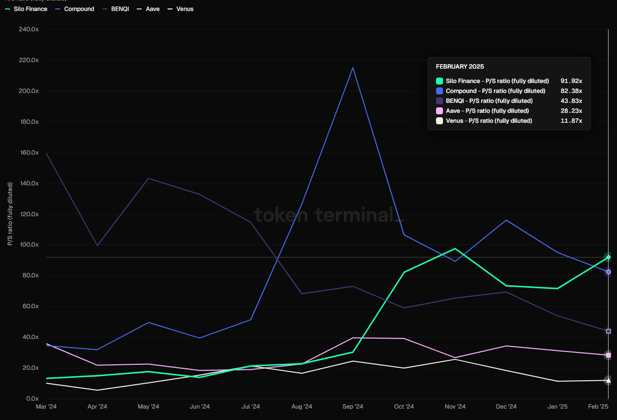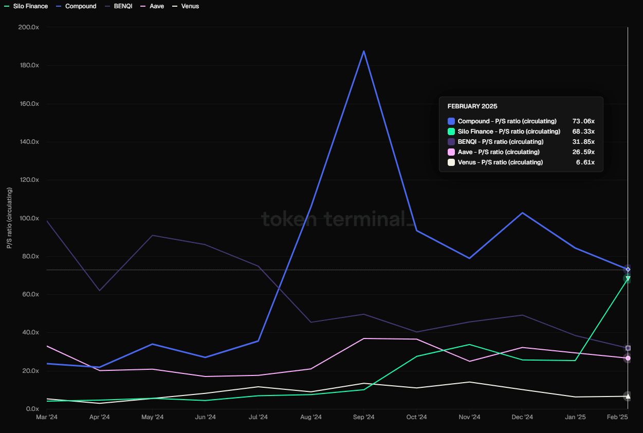 Quando comparado horizontalmente, a métrica PS do Aave é muito menor que a do Compound, Silo e Benqi, mas maior que a de Venus.