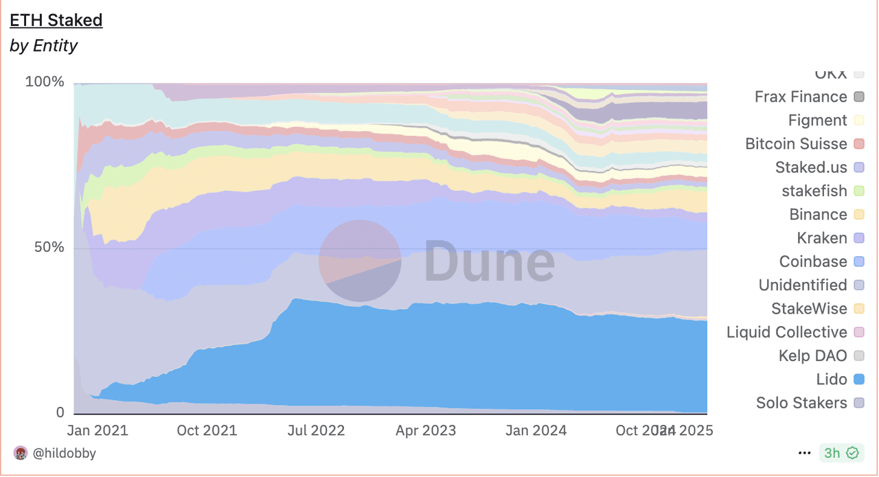 Para cadeias PoS, os stakers determinam a formação de consenso, e o ecossistema Ethereum é particularmente dedicado à descentralização entre as cadeias PoS tradicionais. Como resultado, as preocupações sobre a escala do Lido têm sido bastante "rigorosas". Quando os ativos staked do Lido atingiram 30% do total da rede Ethereum, houve apelos para limitar o crescimento do Lido. A Ethereum Foundation tem ajustado ativamente seus mecanismos de stake para evitar que qualquer "entidade de stake única excessivamente grande" surja.