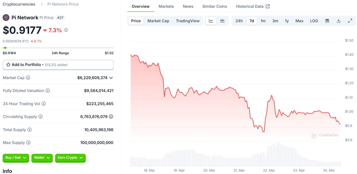 Atualmente, a Rede Pi (PI) está sendo negociada a menos de $1, em queda de quase 70% em relação ao seu pico histórico de $2,98 em fevereiro. Na última semana, o preço caiu 34% e caiu para a 27ª posição no ranking de capitalização de mercado. O volume de negociação agora é um pouco mais de $200 milhões, uma diminuição significativa desde o início de março.