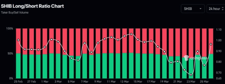 Outro indicador chave que apoia essa nova perspectiva otimista é a razão longa-curta do SHIB. Dados da Coinglass mostram que a razão longa-curta atualmente está em 0,96, indicando uma melhoria estável e rápida em relação a uma baixa de 0,68 em 23 de março.