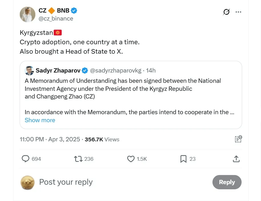 Sua postagem seguiu um anúncio do presidente do Quirguistão, Sadyr Zhaparov, de que a NIA havia assinado um acordo com CZ para receber expertise técnica e serviços de consultoria em blockchain e criptomoeda.