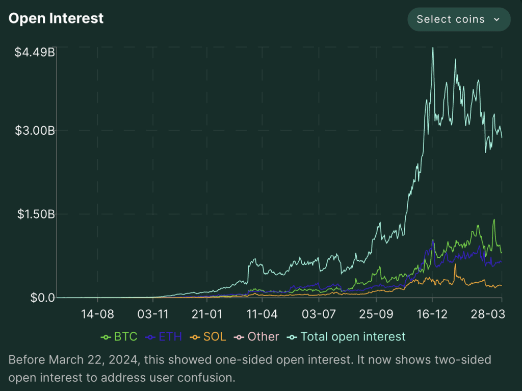 A plataforma de derivativos da Hyperliquid foi lançada de forma suave em junho de 2023, iniciou um programa de pontos em novembro de 2023 e viu um aumento no volume de negociação e no interesse aberto após seu airdrop oficial de token no final de novembro de 2023. Desde dezembro de 2023, o volume diário de negociação de derivativos da Hyperliquid tem uma média entre 4 bilhões e 7 bilhões, atingindo um recorde de um dia de 18,1 bilhões. O interesse aberto também aumentou acentuadamente, flutuando entre 2,5 bilhões e 4,5 bilhões desde dezembro.