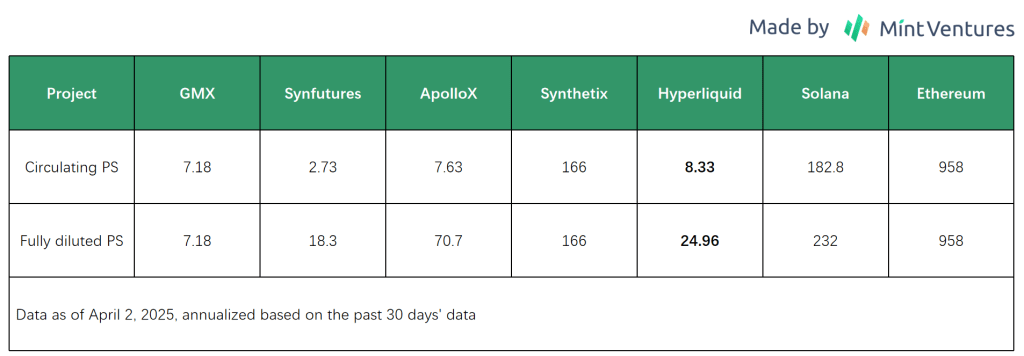 A receita da Hyperliquid nos últimos 30 dias foi de 42,05 milhões de dólares, com uma receita anualizada de 502 milhões de dólares. Com base na atual capitalização de mercado circulante de 4,2 bilhões de dólares, seu PS circulante é 8,33, enquanto o PS totalmente diluído é 24,96. Quando calculado com base no PS circulante, a avaliação da Hyperliquid é comparável à de GMX e ApolloX dentro do setor de exchanges de derivativos. No entanto, comparado aos protocolos de Camada 1, a avaliação da Hyperliquid permanece relativamente baixa.