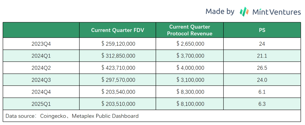 Dada a ausência de projetos diretamente comparáveis no nicho da Metaplex, avaliamos principalmente sua avaliação através da relação capitalização de mercado/receita mensal do protocolo, usando benchmarks históricos para contexto.