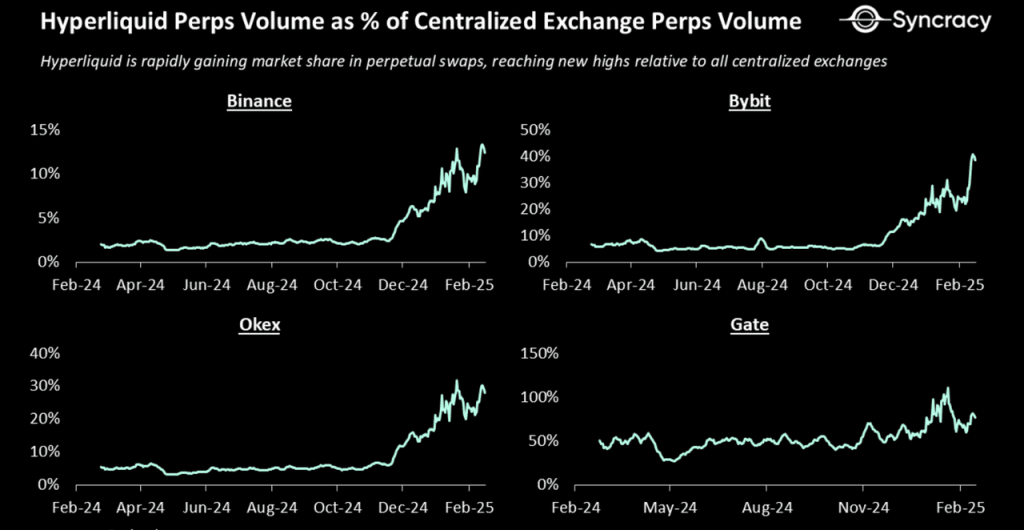Proporção do volume de transação do contrato da Hyperliquid em relação ao das exchanges centralizadas Fonte: Relatório Syncracy