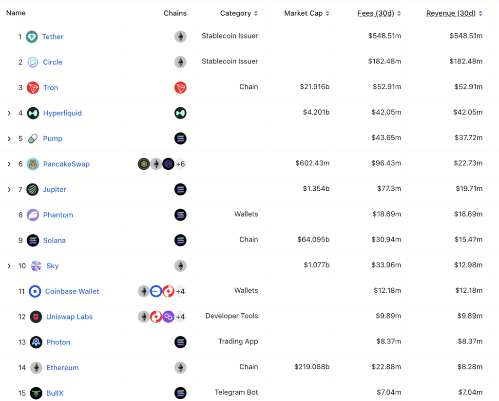 Ranking de receita de 30 dias de todos os protocolos Fonte: DeFillama