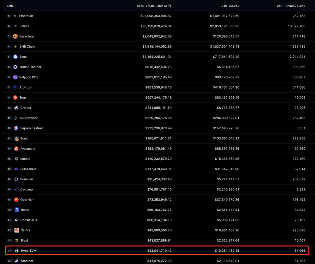 Em relação à sua integração EVM, a Hyperliquid lançou a HyperEVM em alfa em 18 de fevereiro de 2024 e completou sua integração com o protocolo HyperCore existente em 26 de março de 2024. No entanto, devido à infraestrutura incompleta—como a ausência de componentes críticos como pontes cross-chain, implantação limitada de protocolos compatíveis com EVM e falta de programas de incentivo oficiais— a atividade geral da HyperEVM permanece contida. Métricas como TVL, volume de negociação e contagem de transações a colocam aproximadamente na 20ª posição entre todas as redes blockchain.