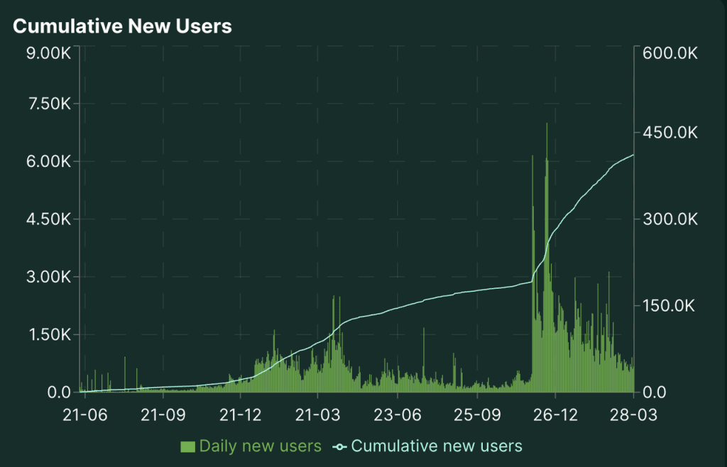 Na frente do usuário, a Hyperliquid viu um aumento rápido em sua contagem de endereços, com endereços de negociação acumulados agora se aproximando de 400.000.