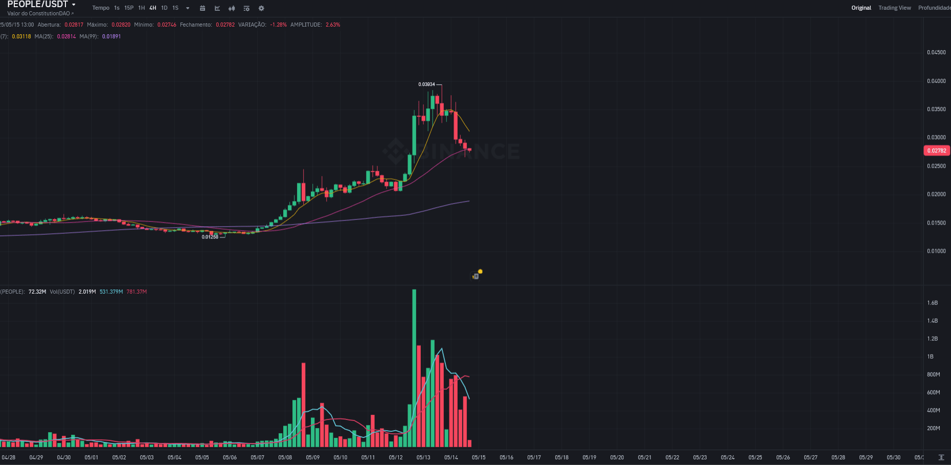 Ação Recente do Preço: O gráfico mostra claramente um pump significativo no preço começando no início a meados de maio. PEOPLE experimentou um forte movimento ascendente, atingindo o pico em torno do nível de 0,045 USDT. Isso foi seguido por uma queda acentuada e rápida, trazendo o preço de volta consideravelmente de seus altos.
