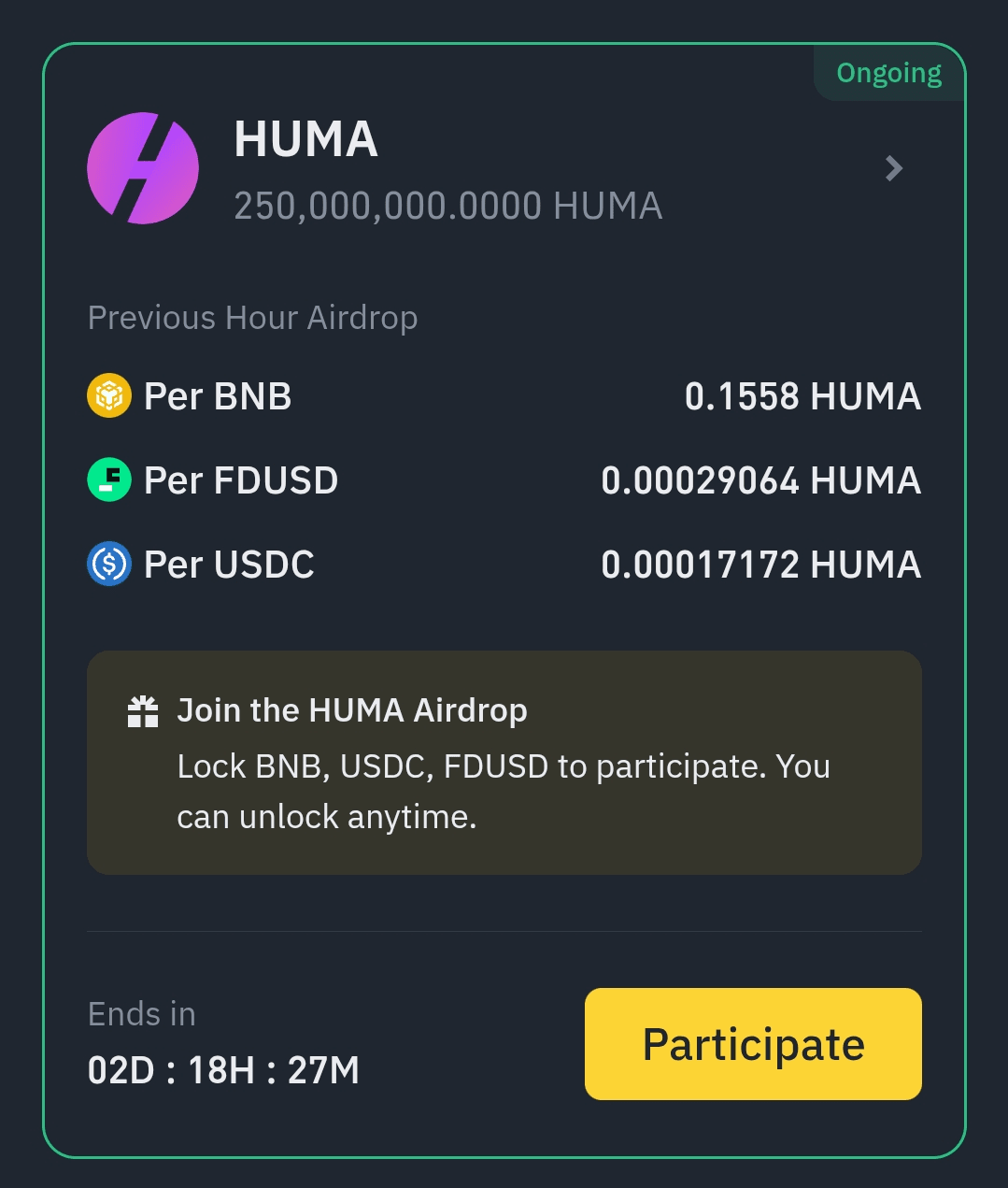 A partir de 23 de maio de 2025, a Binance lançou seu 70º projeto Launchpool: Huma Finance (HUMA), uma rede PayFi projetada para acelerar pagamentos transfronteiriços e por cartão, proporcionando acesso instantâneo à liquidez.