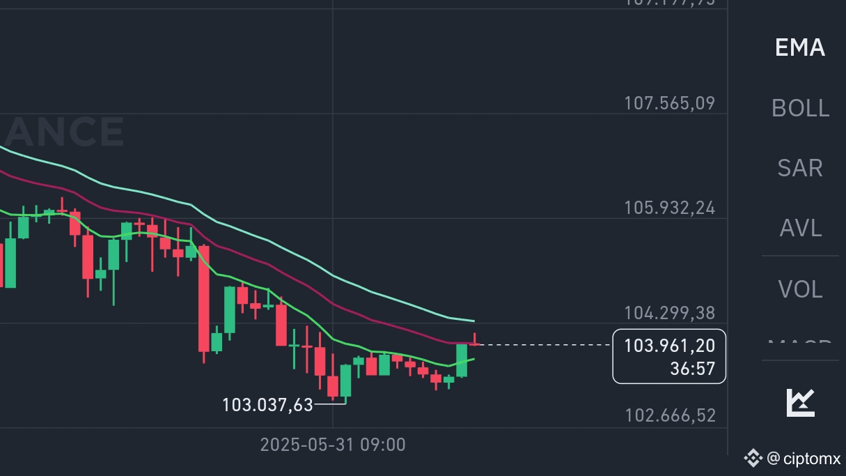 Zona de Entrada: 104,500 105,000 USDT (perto da resistência MA5 e R1).