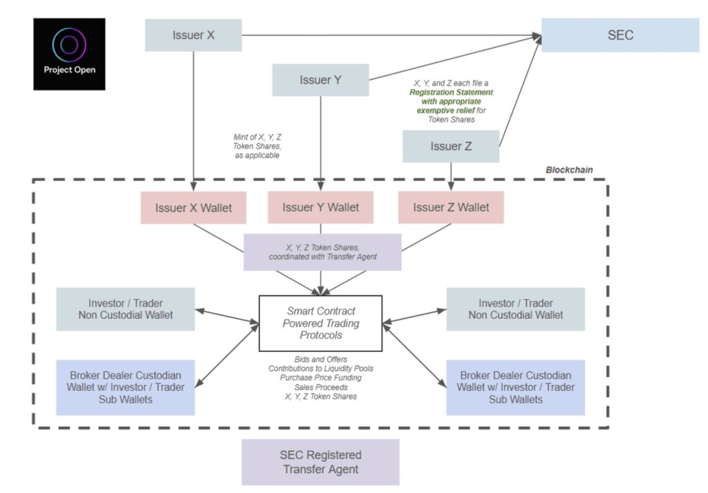 O processo de emissão e negociação de ações tokenizadas dos EUA defendido pelo Projeto Open é o seguinte: