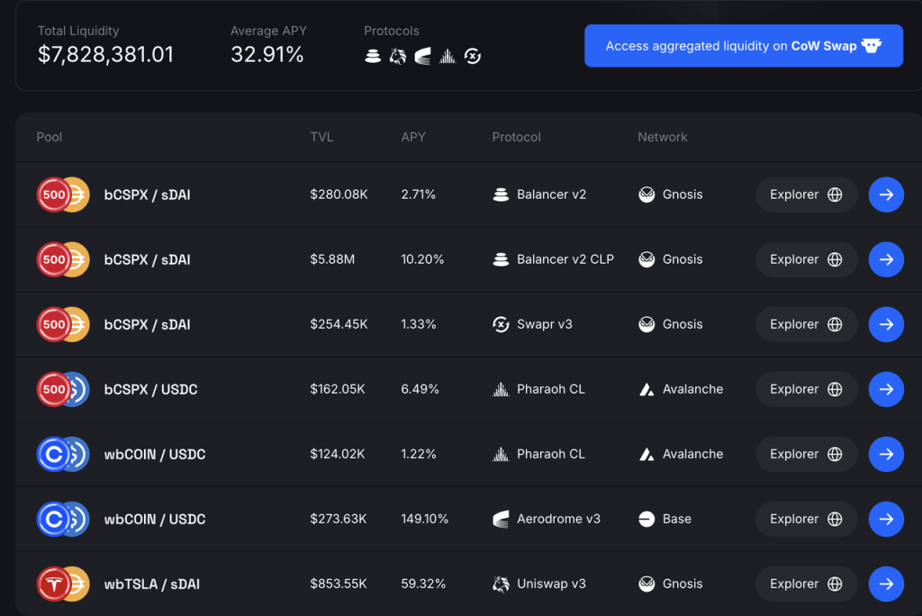 A liquidez em cadeia da Backed Finance provém principalmente do índice SPX, Coinbase e Tesla. Os usuários criam liquidez emparelhando tokens bSTOCK com stablecoins em pools AMM. O atual TVL em todos os pools de liquidez se aproxima de 8 milhões de dólares, com uma APY média de 32,91%. A liquidez é distribuída entre Balancer e Swapr na Gnosis Chain, Aerodrome na Base e Pharaoh na Avalanche. Notavelmente, o pool de liquidez bCOIN-USDC atualmente oferece uma APY alcançando 149%.