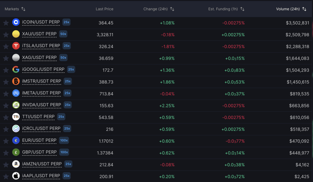 Na frente das bolsas centralizadas, a Bybit lançou recentemente uma plataforma de negociação de ações dos EUA baseada no MT5. Este produto também adota mecânicas semelhantes a contratos perpétuos, não executando transações reais de ações, mas facilitando a negociação de índices com stablecoins como colateral.