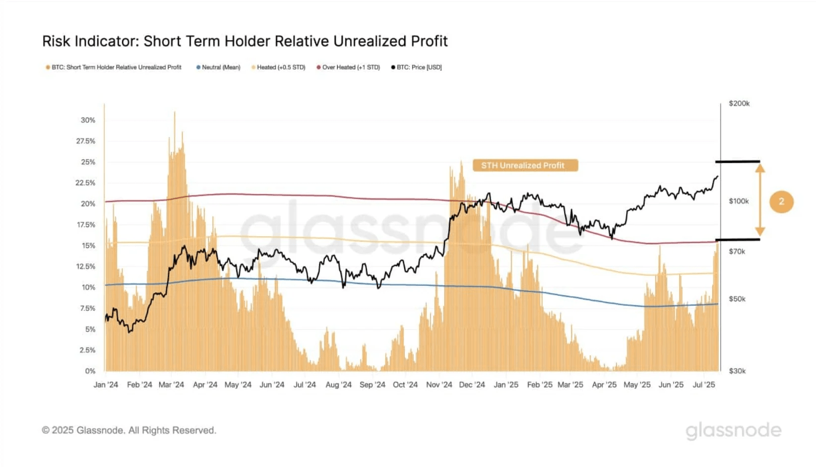 Historicamente, topos locais frequentemente aparecem quando essa métrica entra na zona “quente” — como visto em janeiro e abril de 2024. Atualmente, de acordo com dados da Glassnode, o índice permanece abaixo da zona “quente”, implicando que o BTC ainda tem espaço para crescer.