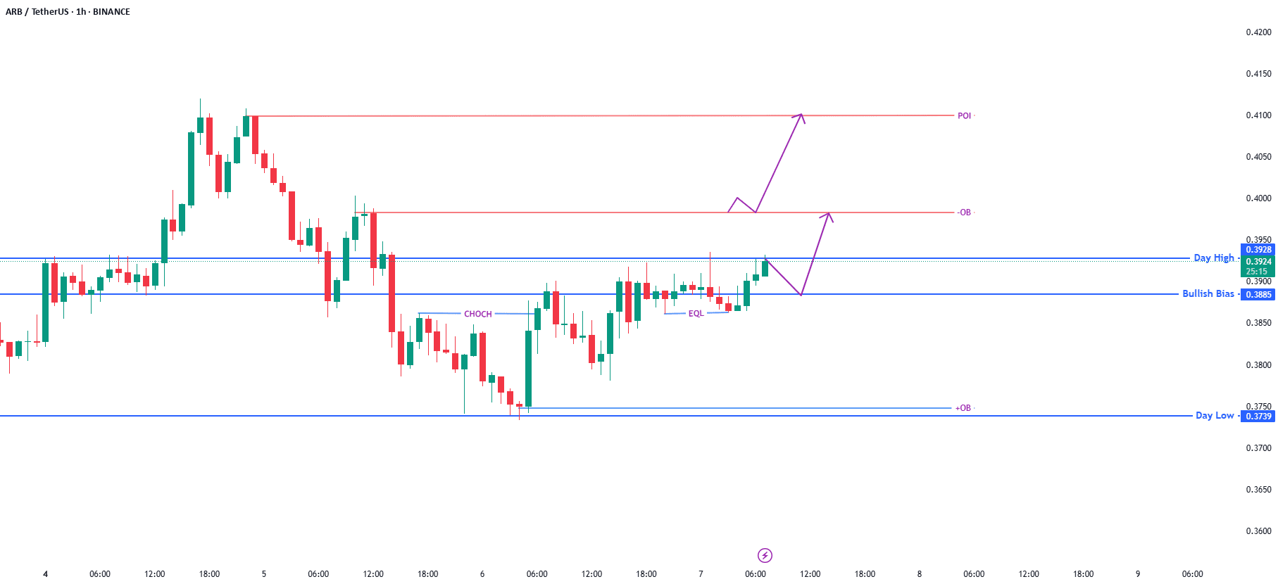 CHoCH confirmou a intenção de alta, e o preço agora está ultrapassando a máxima do dia. Observando o reteste em torno da Bias de Alta antes de um impulso para o OB superior e POI.