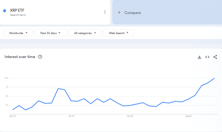 De acordo com o Google Trends, as buscas por ‘XRP ETF’ subiram de uma pontuação de 12 em 10 de julho para 100 em 10 de agosto, marcando o nível mais alto de interesse nos últimos 30 dias.
