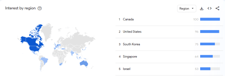 O Canadá lidera a atividade de pesquisa, seguido pelos Estados Unidos, Coreia do Sul, Cingapura e Israel.