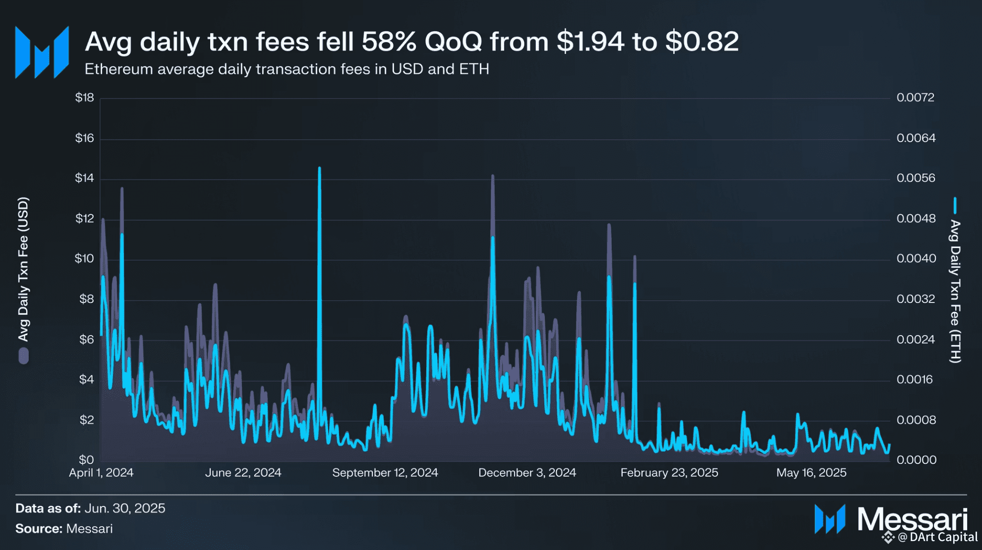 As últimas notícias da rede Ethereum chamam a atenção de muitos. Com base em dados da Messari, a taxa média de transação diária na rede Ethereum sofreu uma queda drástica, caindo 58% trimestralmente (QoQ), de $1,94 para apenas $0,82.