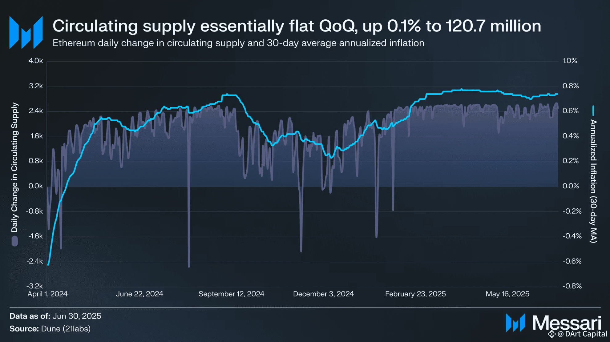 The chart shows that the supply of Ethereum (circulating supply) is relatively stable. By the end of June 2025, the supply only increased slightly by 0.1% QoQ, reaching a total of 120.7 million ETH.
