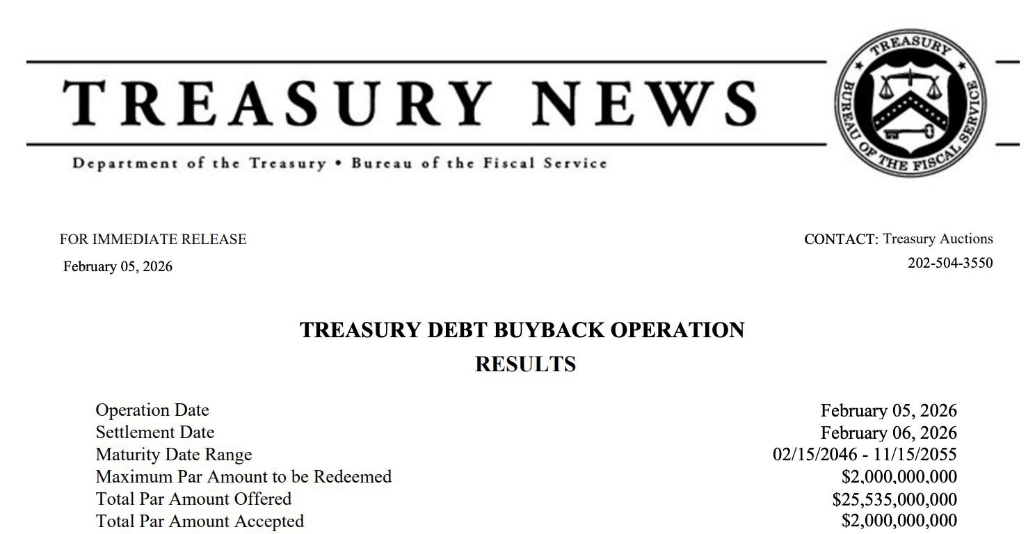 WASHINGTON, D.C. — O Departamento do Tesouro dos EUA recentemente intensificou a recompra de dívida pública, recomprando títulos proprietários em quantidades que atraíram maior atenção do mercado. Nas operações mais recentes, o Tesouro comprou vários bilhões de dólares em sua própria dívida — incluindo uma recompra adicional notável de $2 bilhões que elevou o total para aproximadamente $14,5 bilhões em ações recentes, marcando um dos maiores esforços de recompra em sua história.