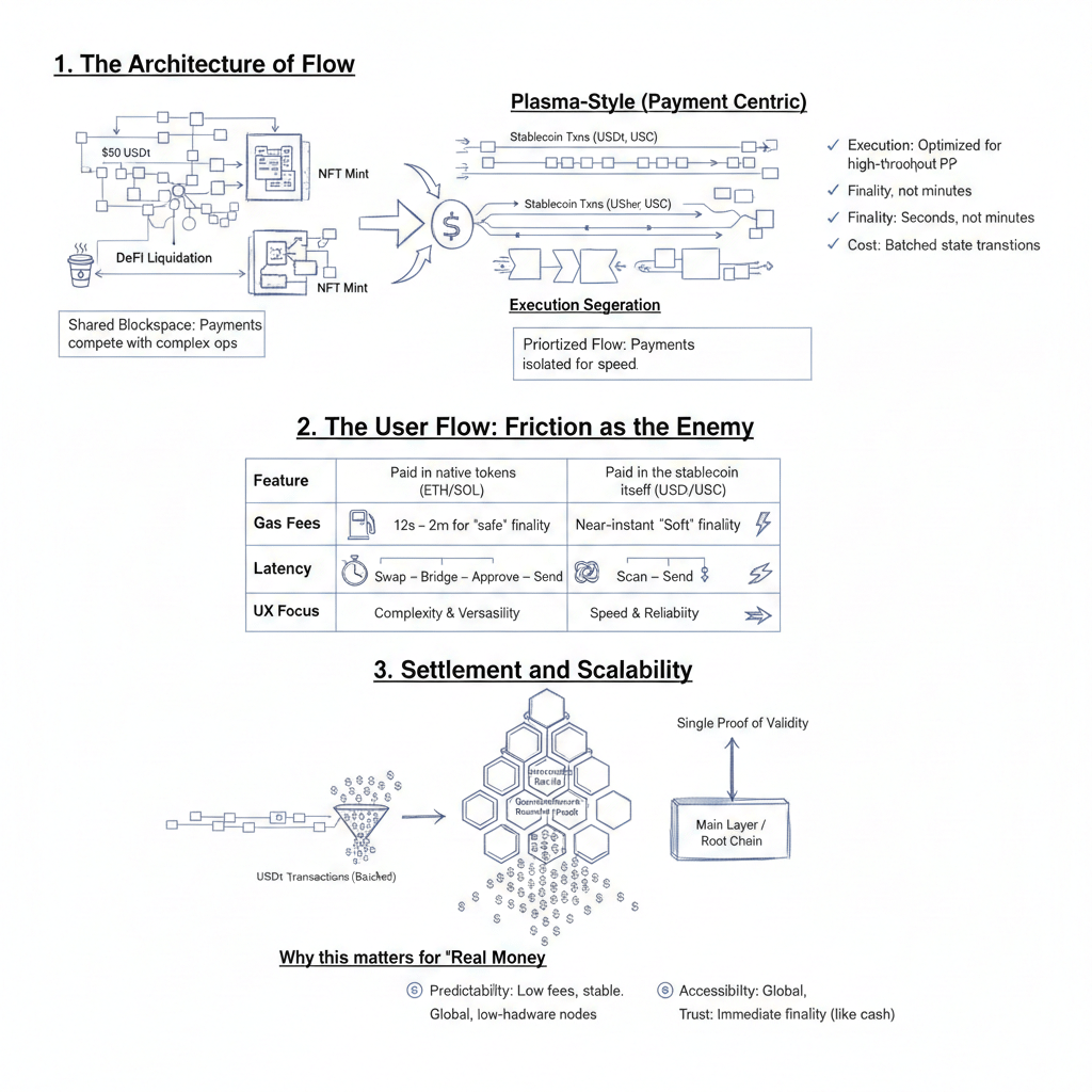 O Plasma parece estar construído para uma realidade muito específica que a maioria das cadeias ainda trata como uma missão secundária: os stablecoins já estão sendo usados como dinheiro real por pessoas reais, e a infraestrutura precisa se comportar como infraestrutura monetária todos os dias, não apenas durante horas de mercado tranquilas. Quando o Plasma afirma que foi projetado para pagamentos globais de stablecoin de alto volume e baixo custo, isso não é apenas uma posição, é uma escolha de design que se reflete na forma como falam sobre execução, finalização e fluxo de usuários, porque se o principal trabalho é mover USDt em escala, então qualquer coisa que atrase a liquidação ou force etapas adicionais se torna o inimigo da adoção.