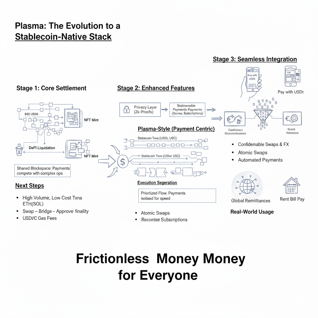 O que vem a seguir, com base na própria linguagem de visão geral da cadeia da Plasma, parece um movimento constante da infraestrutura de liquidação central para um stack nativo de stablecoin mais completo que é lançado em etapas, com ênfase em recursos que tornam o movimento de stablecoin mais fácil, mais privado quando necessário, e mais integrado com caminhos de uso real, porque em escala os vencedores não são as cadeias com as narrativas mais barulhentas, mas aquelas que removem a fricção até que os usuários parem de notar que estão usando uma blockchain.