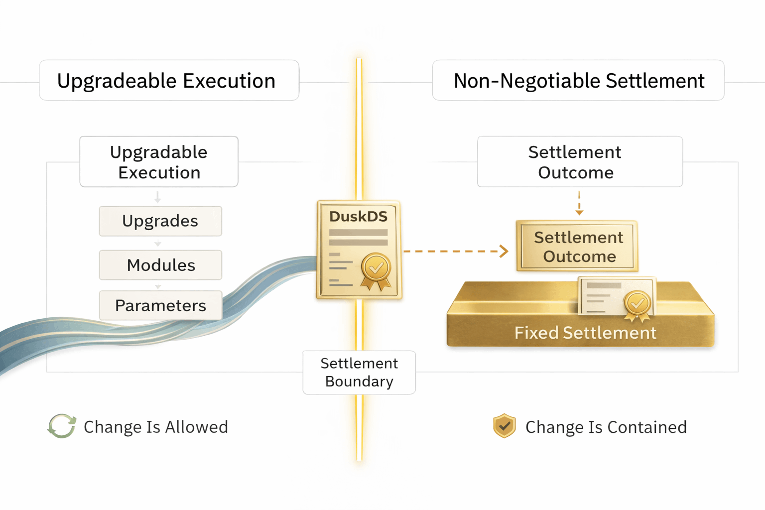 Upgradeable execution without fixed settlement is chaos.