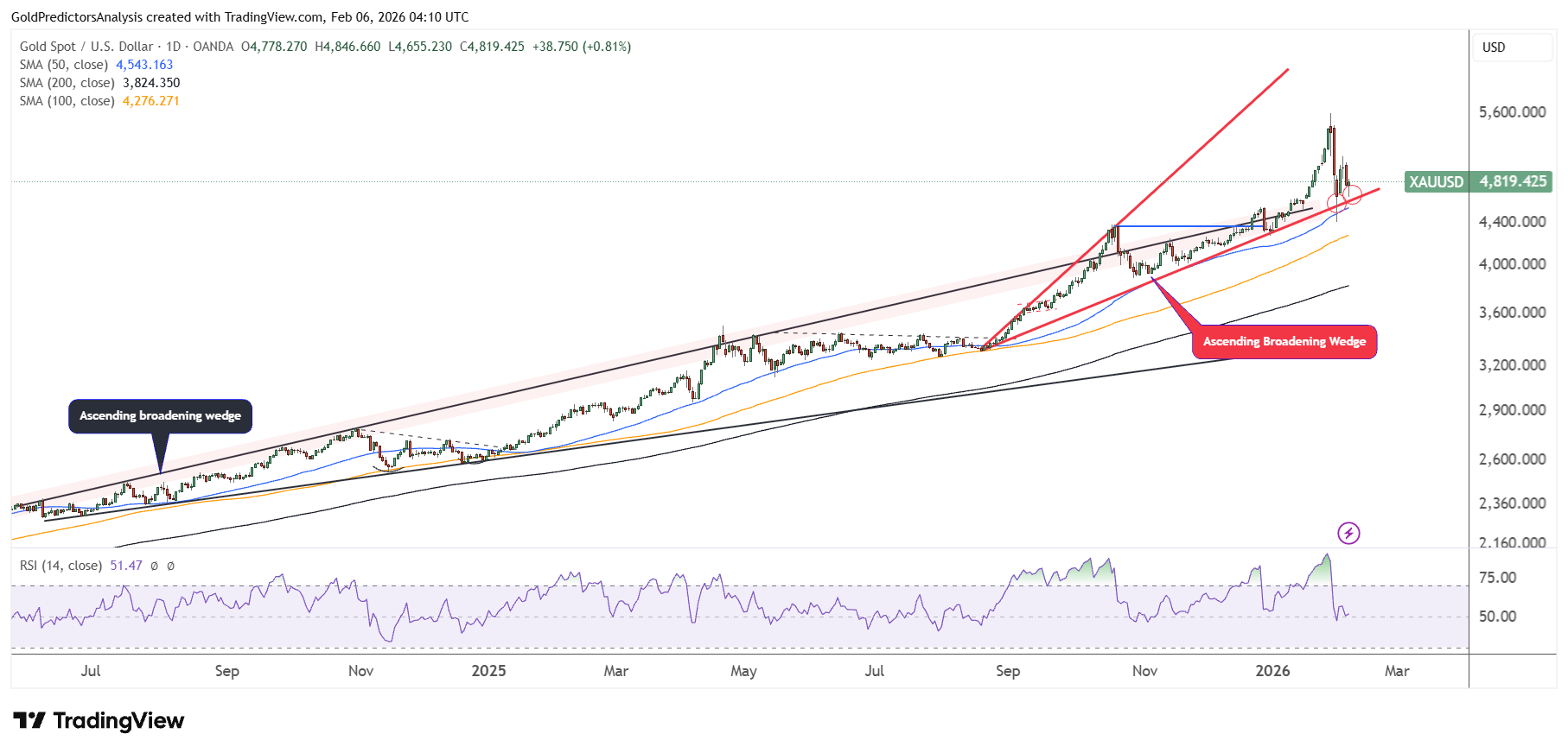 The daily chart for spot gold shows that the price has dropped quickly from $5,600 to $4,400 and then produced a rebound. This rebound is due to the strong support around $4,400, which is seen at the intersection of the 50-day SMA and the support line of the ascending broadening wedge pattern.