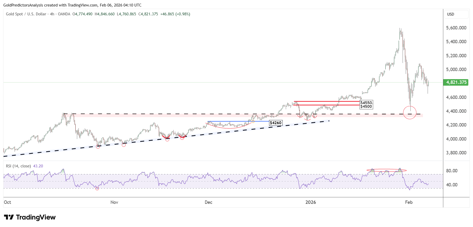 The 4-hour chart for spot gold also shows strong support around $4,400. This support is defined by red highlighted region, which is the support region marked by black dotted trend line of the ascending triangle pattern.