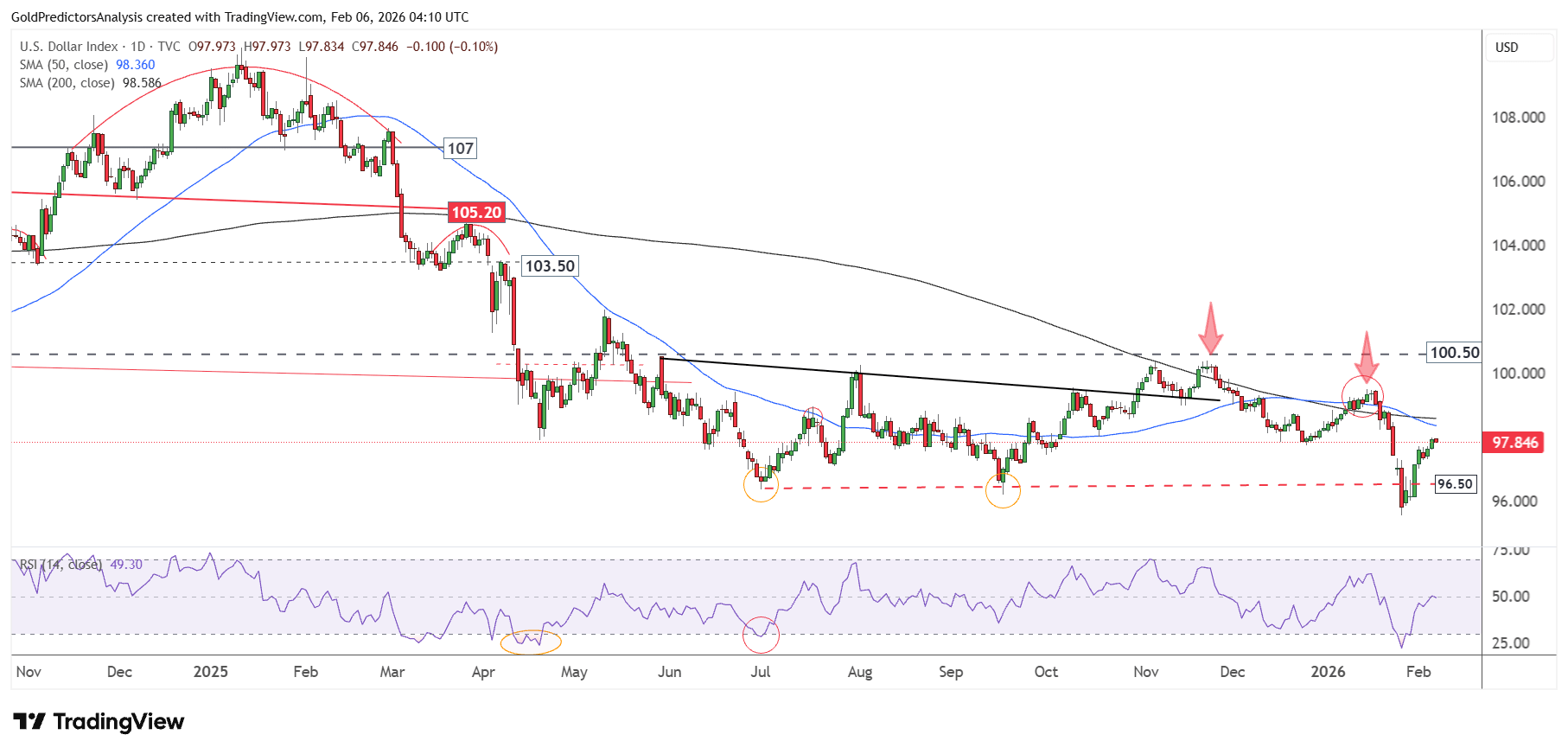The 50-day SMA trades below the 200-day SMA. However, the strong price fluctuations around these moving averages indicate uncertainty in the USD Index. The RSI has reached the midline, which indicates a correction may develop in the short term.