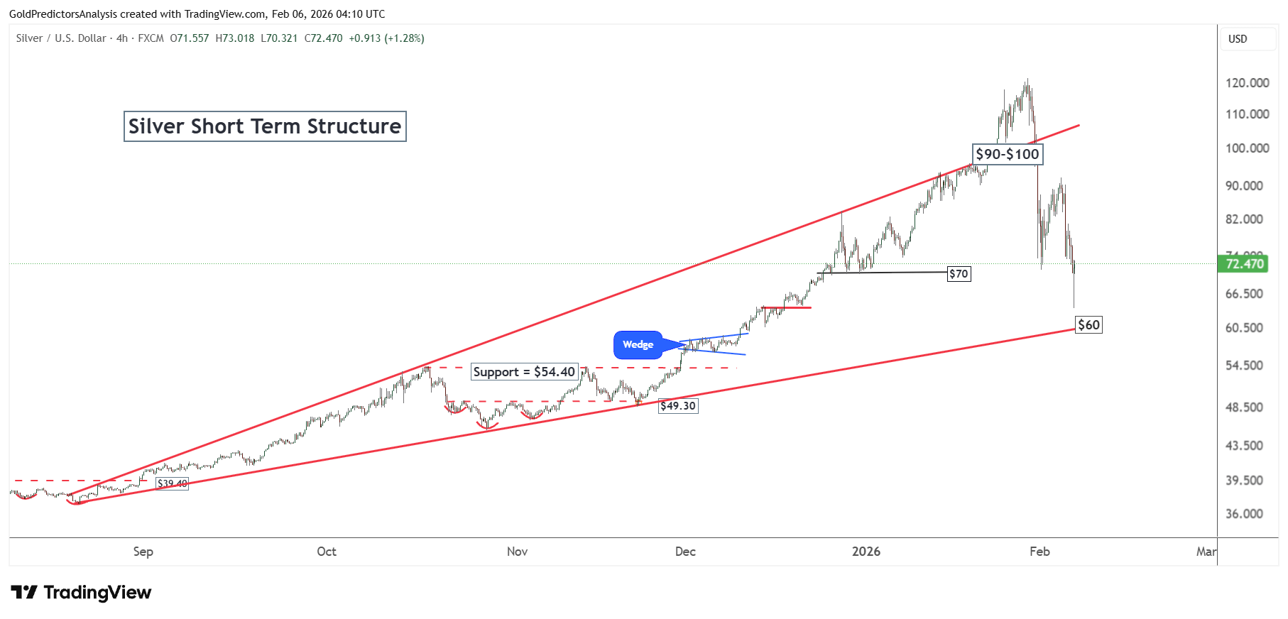 The 4-hour chart for spot silver shows that the price trades within the ascending broadening wedge pattern between $60 and $100. As the price nears $60 support, the possibility of a strong rebound in silver develops. Overall, the price structure in silver remains strongly bullish and looks toward further upside.