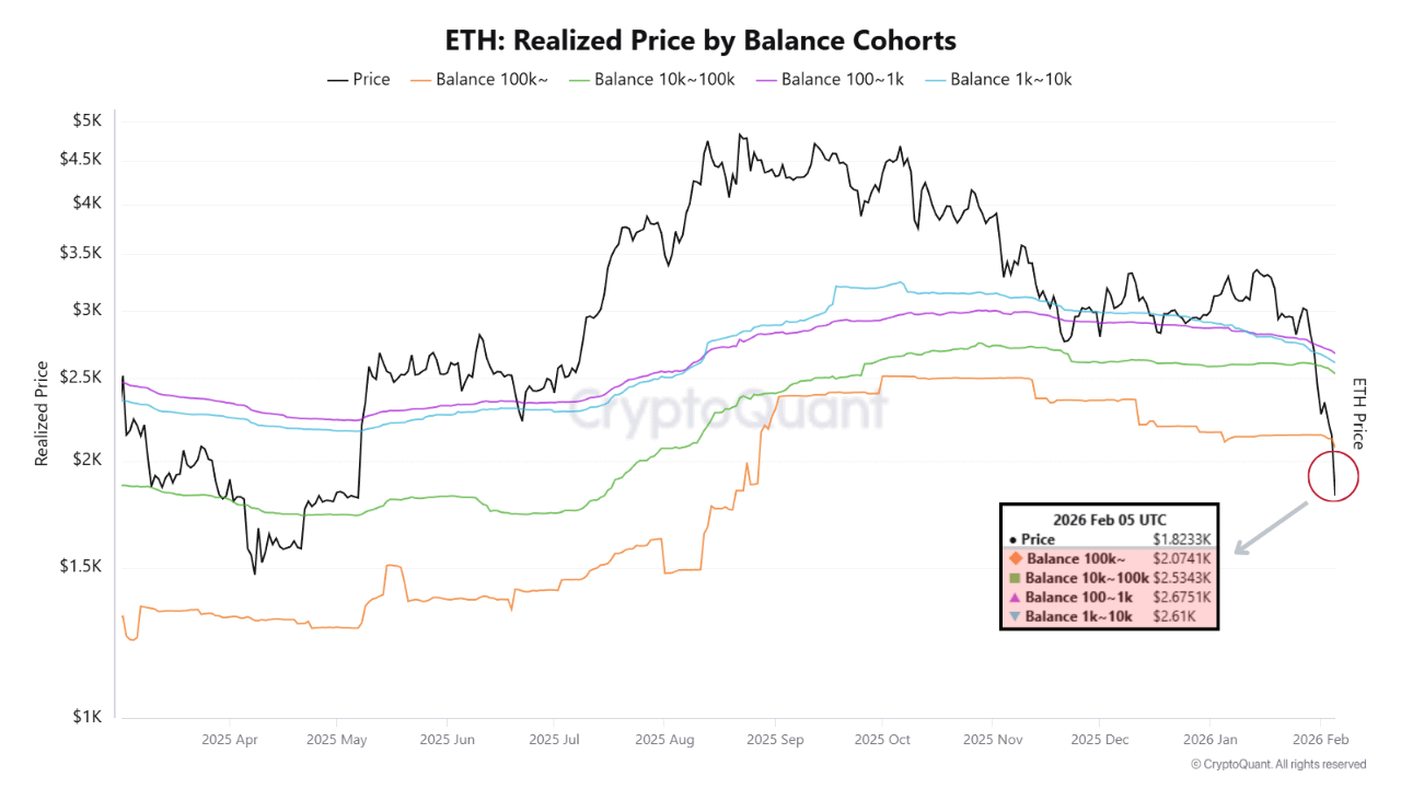 A métrica de Preço Realizado por Coortes de Saldo revela uma violação limpa em todos os principais grupos de detentores, com o preço realizado do grupo de 100k+ ETH (~$2,074) atuando como a vítima mais notável dessa liquidação.
