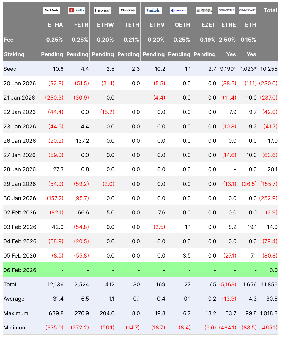 Tabela de fluxos de ETFs de Ethereum à vista. Fonte: Farside Investors