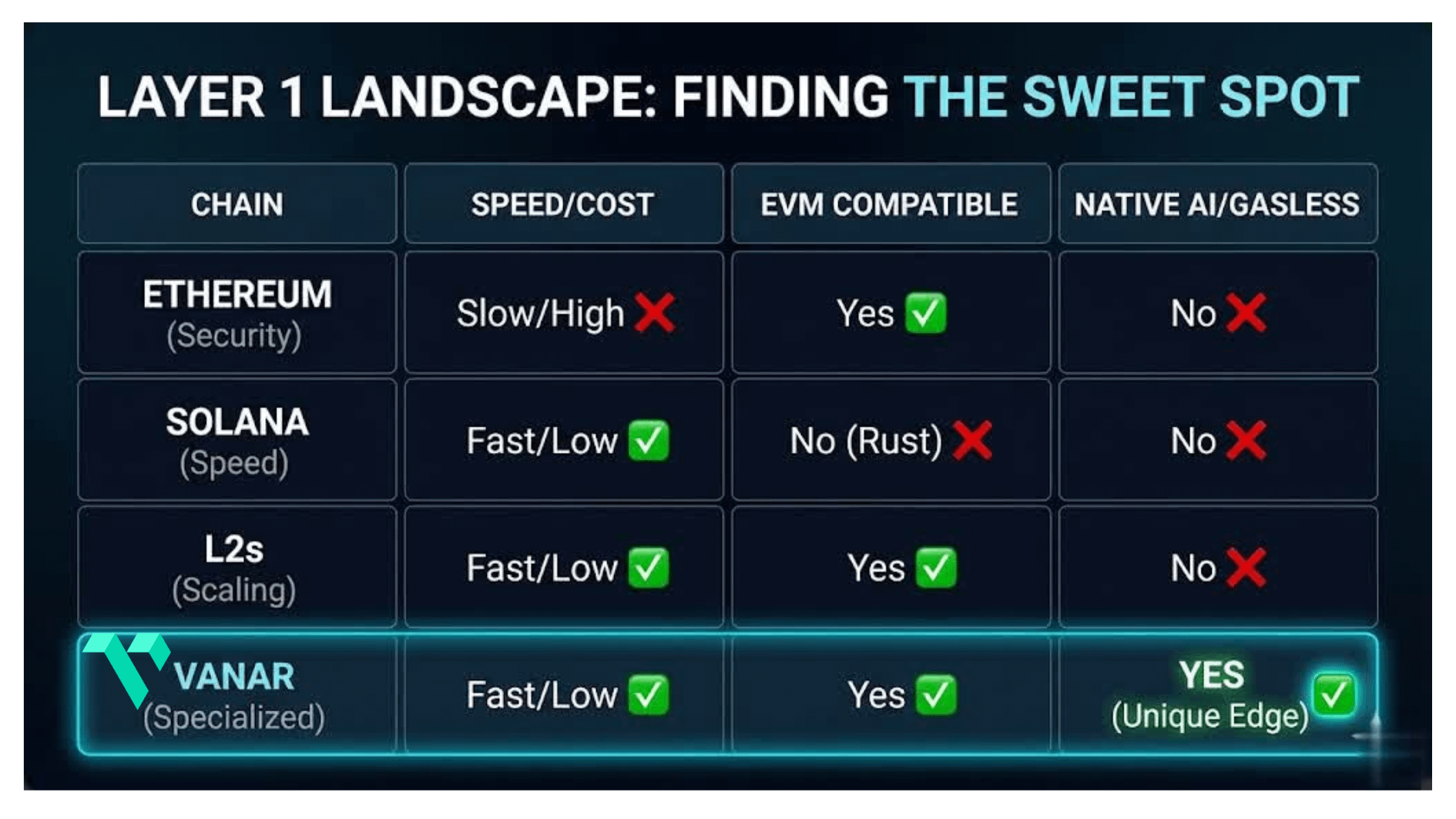 Vanar apresenta o recurso extra: dados de IA embutidos e transações sem gás. Nenhum dos outros L1 primários tem essas partes no início, e também não carece de um arranjo nativo sem gás fluido.
