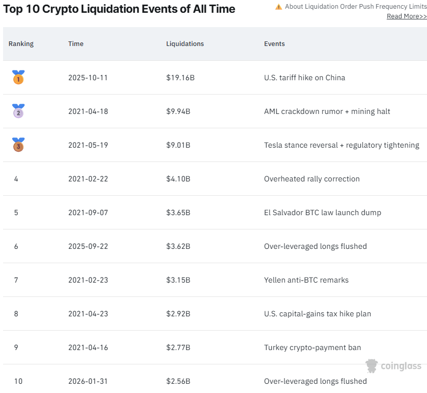A indústria registrou seu 10º maior evento de liquidação em 31 de janeiro, quando mais de $2,56 bilhões em posições alavancadas foram eliminadas, de acordo com a plataforma de dados de derivativos CoinGlass.