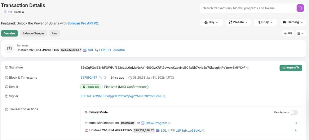 Dados on-chain revisados pela empresa de segurança blockchain CertiK mostram que aproximadamente 261.854 Solana (SOL) (no valor de cerca de $27,2 milhões) foram desempilhados e transferidos de carteiras controladas pelo Step Finance.