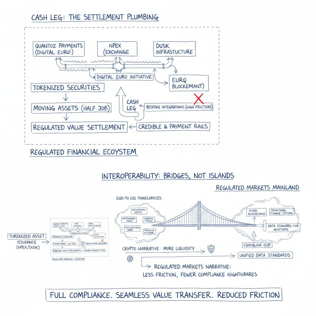And then there’s the “cash leg,” which is the part people skip when they talk about tokenized securities. Quantoz Payments’ post about EURQ frames it as a digital euro initiative involving Quantoz Payments, NPEX, and Dusk. I’m not reading that as a marketing bullet. I’m reading it as an attempt to get the settlement plumbing right—because moving assets around is only half the job; you also need a credible, regulated way to settle value.
