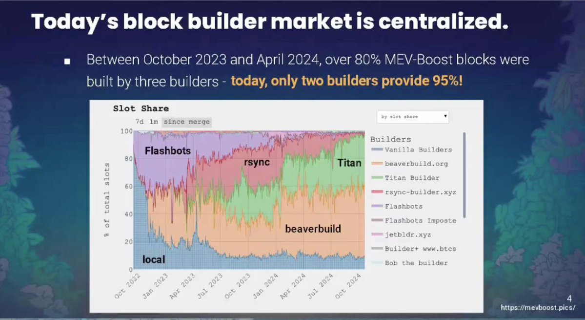 最引人注目的是,现在 80-90% 的以太坊区块仅由 2 个构建者生产。这种集中使交易包含受少数实体控制,他们可以审查任何他们想审查的东西。