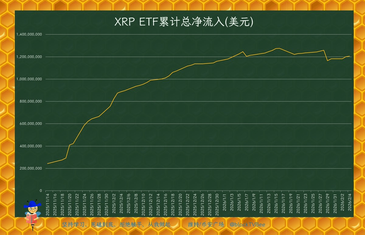 Além disso, o fluxo de fundos líquidos total do ETF XRP é apenas inferior ao do BTC e ETH, superando o SOL. Até 5 de fevereiro, o fluxo líquido de fundos do ETF XRP nos EUA era de 1,21 bilhões de dólares. Desde que começou a ser negociado em 14 de novembro, mesmo com a queda contínua do mercado, o ETF XRP ainda mantém um fluxo de fundos, com apenas 4 dias de saída líquida de fundos, e o restante do tempo com entrada líquida.