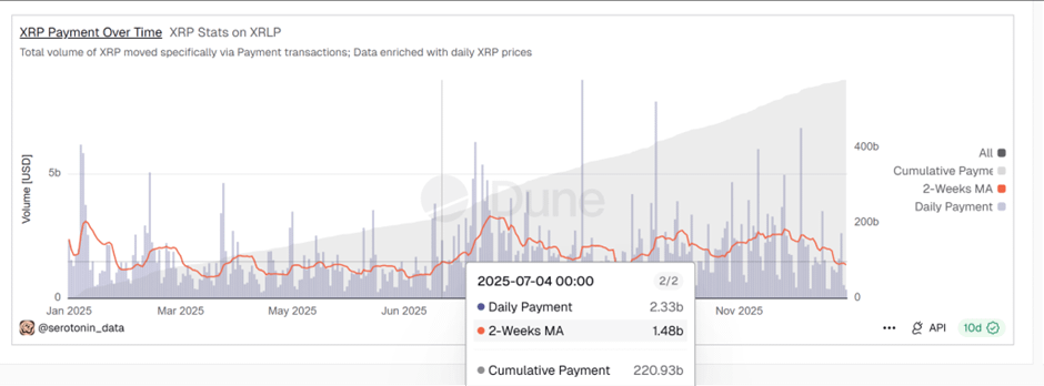 Os dados da Dune mostram que em 2025, o pagamento médio diário de XRP é de cerca de 1,5 bilhões de dólares. O total de pagamentos em 2025 é de cerca de 600 bilhões de dólares.