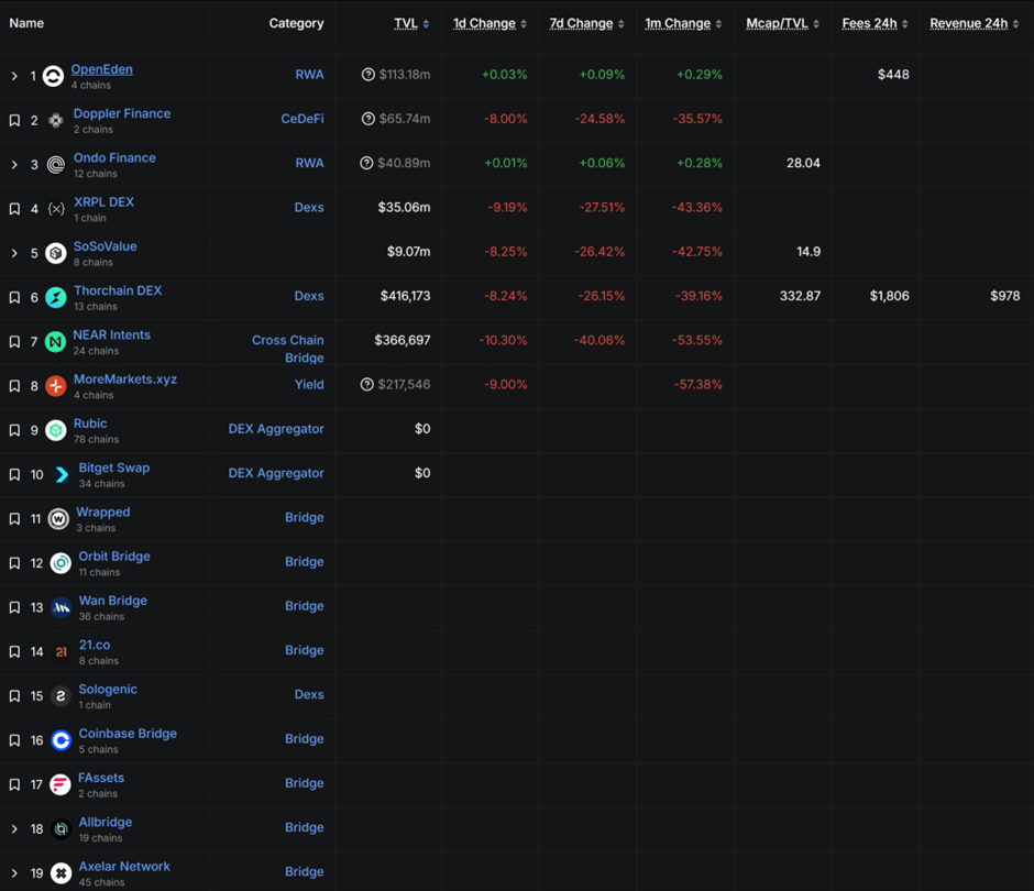 De acordo com a defillama, existem 19 protocolos DeFi na cadeia XRP Ledger. Isso inclui RWA, DeFi, CeDeFi e pontes cross-chain.